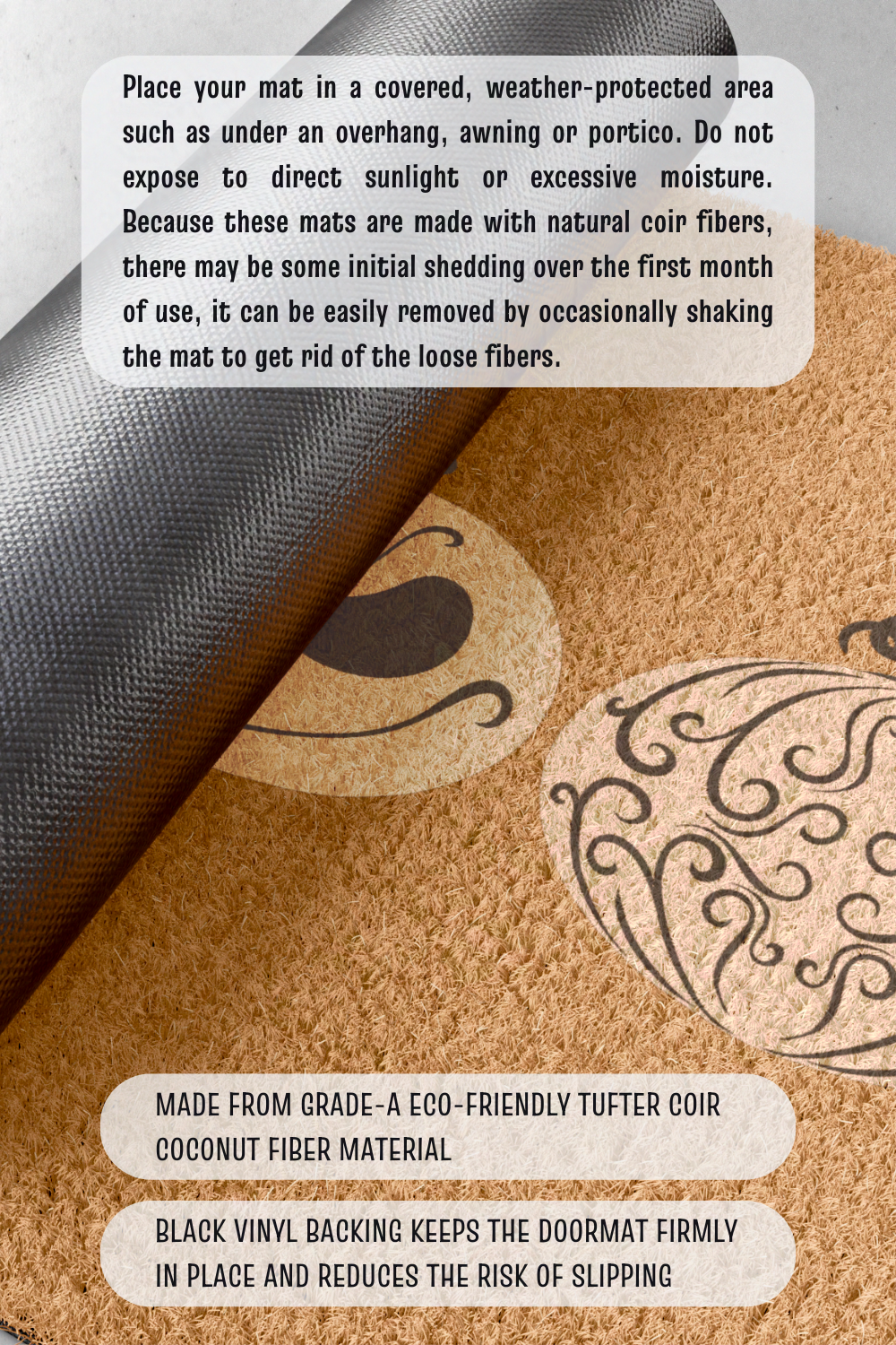 Made from durable, textured coconut coir with a sturdy vinyl backing, this mat isn’t just for looks — it’s built to handle real-world messes, from leaf piles to misadventures in the woods behind Spiral Hill.